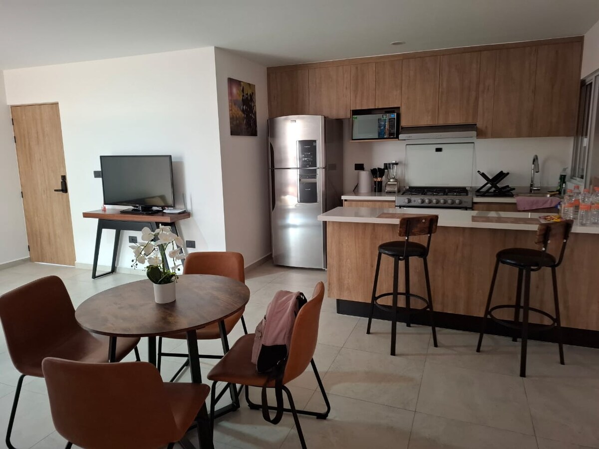 Enjoy a peaceful stay in our beautiful apartment, with an exceptional location in the Intercity Condominium, just a few minutes from El Refugio, Zibatá and Zakia. The apartment has: 1 Bedroom with King Size bed and full bathroom. 1 Bedroom with double bed. Cozy and elegant living and dining room. Equipped kitchen. Second full bathroom. 1 parking space inside the condominium. Swimming pool: prior reservation required, subject to availability.