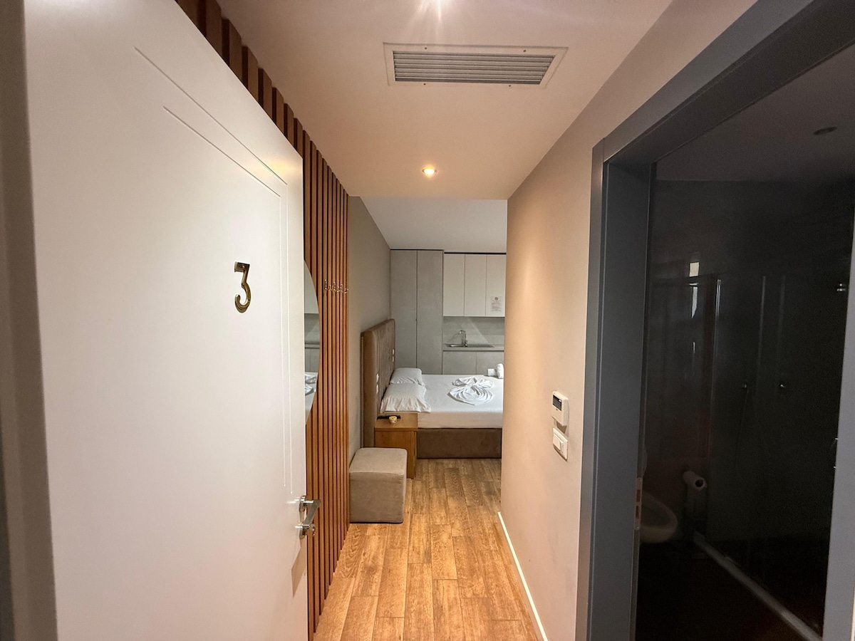 Enjoy a stylish lovely studio 11 steps from the city center(Scanderbeg Square). Everything is accessible with walking distance. The area is famous for it's shops, restaurants and sightseeings. You can park your car safely underneath the Scanderbeg Square. The Apartment consists of a bedroom with a double queen bed and a toilet.Equipped with TV, Air Conditioner, fridge. The apartment is located on the 5-th floor. Internet is 100 mbps.