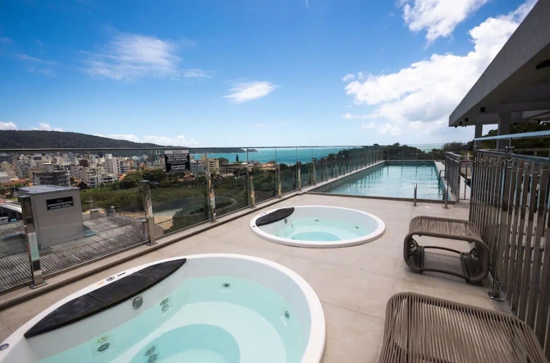 Apartamento com Jacuzzi privativa/aquecida e linda vista para o mar, jacuzzi e rede na sacada. Cozinha completa (fogão, geladeira, micro-ondas, cafeteira, torradeira e demais utensílios básicos) A propriedade tem um pátio amplo, churrasqueiras e piscina (compartilhadas). Uma vaga de estacionamento gratuito. Está localizada em uma região tranquila. Ficamos próximos das praias: Sepultura, Lagoinha e Retiro dos Padres (5min a pé). E ficamos cerca de 15min a pé do Centro de Bombinhas.