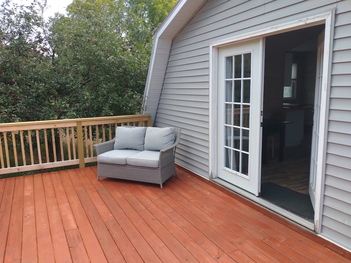 此房間設有獨立入口,附設有頂的門廊,如果隔壁房間被租用,則為共用。 它還有一個圍欄的戶外露台,配有野餐桌。 小木屋朝東,所以門廊變暖,而房間保持涼爽。 湖泊和私人碼頭步行即可到達。