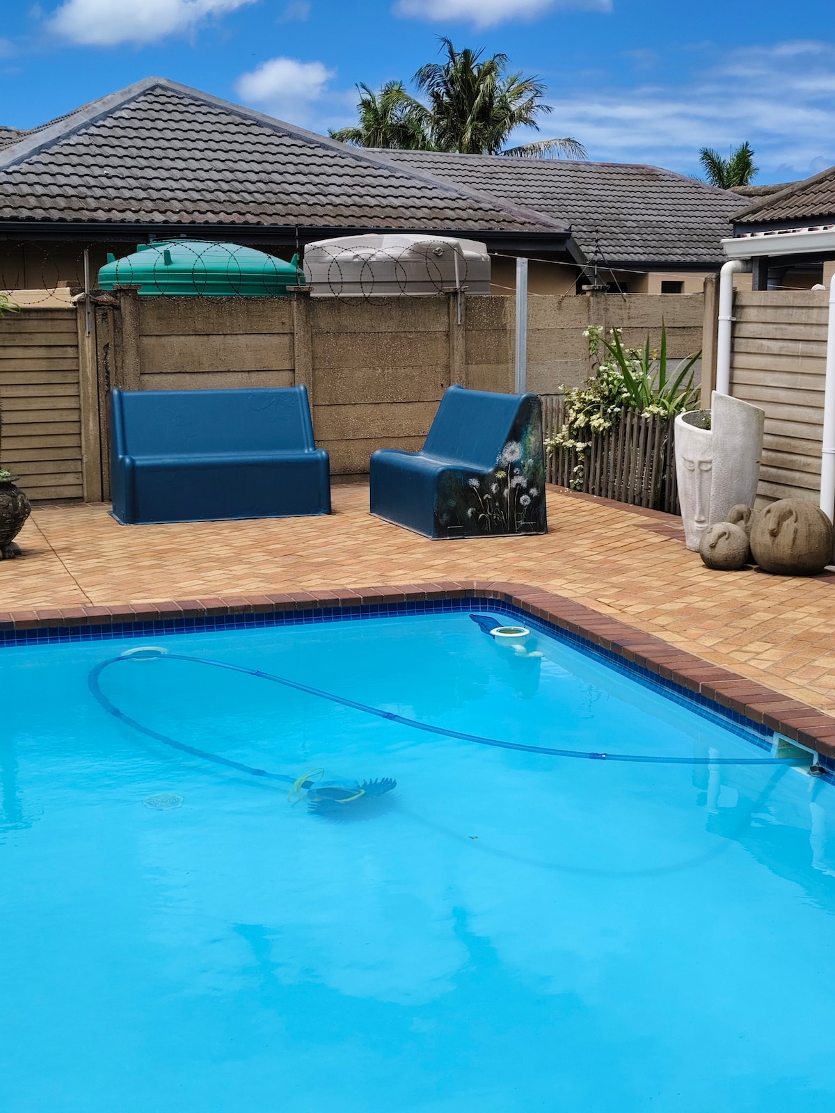 位於理查茲灣( Richards Bay )的私人客用住房。 單臥室自炊式單位,配有1.8米寬雙人牀和空調。套房浴室配有淋浴間、馬桶、洗手臺和步入式衣櫃,包括小保險箱。 廚房配備微波爐、冰箱、小爐子和兩個電熱爐。 起居區有一張雙人沙發可容納額外房客,並提供免費WiFi、Netflix、Prime Video和YouTube供您娛樂。 可使用泳池的私人braai和lapa區域