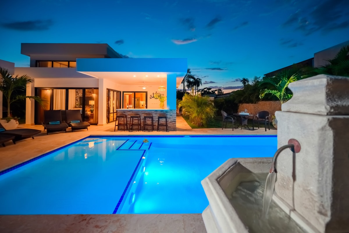 🌴 Palm Escape – Your stylish private villa just a 10-min walk to Encuentro Beach! Enjoy a beautifully designed modern villa with a private heat pump ( upon request ), lush tropical garden, shaded patio, full A/C, smart TVs, complete kitchen, outdoor BBQ, and a stunning custom mural by a renowned Dominican artist. Located in a secure gated community with 24/7 security. Perfect for couples, families, or friends seeking comfort and Caribbean charm. 💦☀️