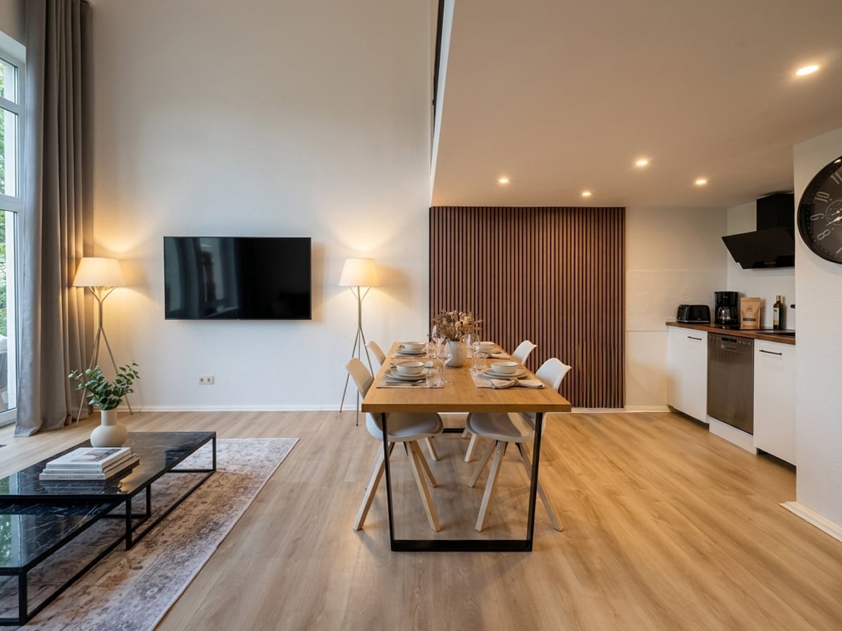這個時尚的房源非常適合團體旅行。 寬敞的大型畫廊公寓 生活、烹飪、生活 房間和牀鋪 1間臥室(標準雙人牀) 1間臥室( 160x 200公分牀至180公斤) 1張沙發牀 浴室 配有淋浴間、浴缸和馬桶的浴室 1間客用盥洗間 廚房 開放式廚房 配備壁爐和用餐區的客廳 公寓位於市中心,距離火車站和Hattinger老城區不遠。