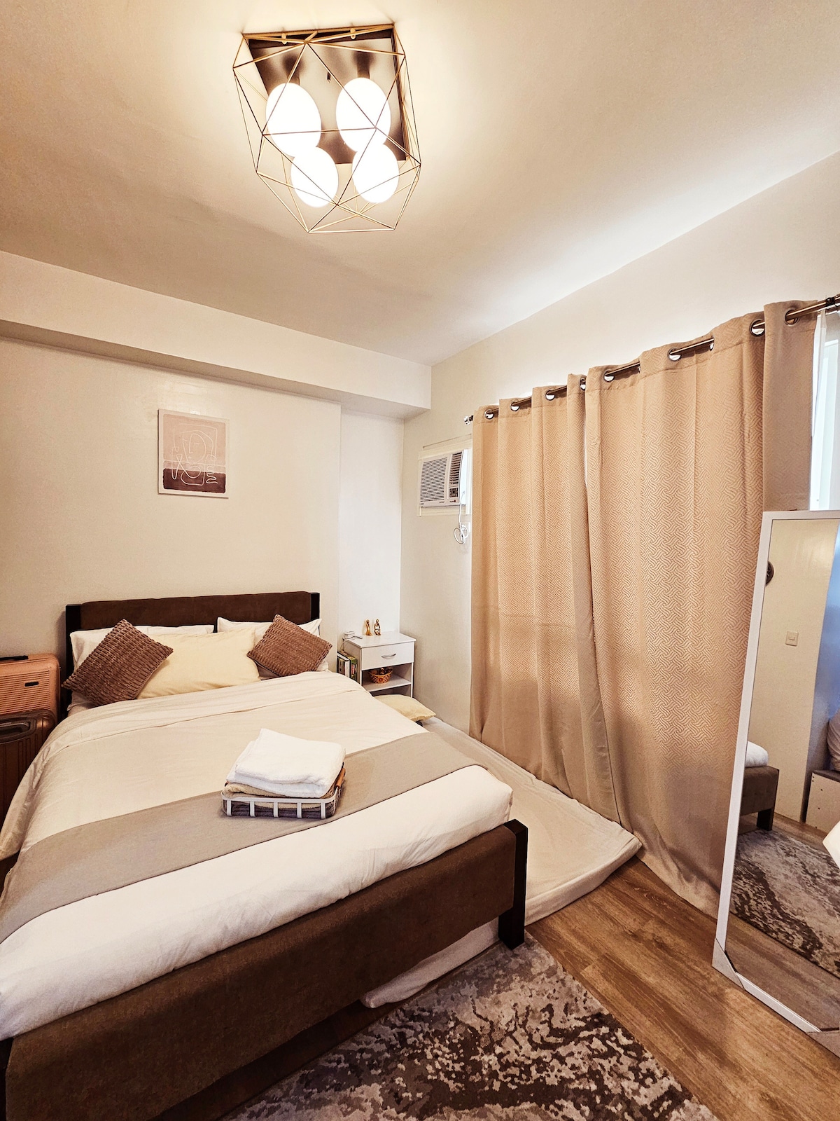 乾淨且功能齊全的空間,非常適合遠距和放鬆。配備100mbps Globe WiFi、55吋智慧電視和Netflix。配有冰箱、咖啡機、電鍋和電磁爐,讓您在入住期間烹飪簡單的餐點。空調設備齊全,配有24小時備用發電機。 房間配有雙人床,可容納2位成人和1位兒童。這裡有一張雙人沙發床,可供2位成人入住。提供4人額外的床單和毛巾,以及基本的盥洗用品。