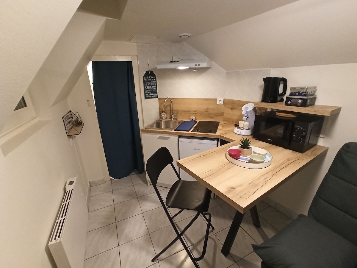 歡迎! 我們車庫內的 30 平方公尺單間公寓。 獨立入口。 翻新、安靜、溫馨。 2人+ 2人額外 BZ 沙發床(140 X 190 公分)+ 2 人沙發床。 WiFi。辦公桌。百葉窗。 可提供清潔服務(20€) 街邊免費停車。 火車站:700公尺 麵包店:400公尺/肉店:250公尺 大型超市:450公尺 酒吧-煙草店:400公尺 市中心,拉瓦勒老城:400公尺 靠近校園。 如需更多詳細資訊,請隨時與我們聯絡。 期待很快與您見面! Pierre 和 Sandrine