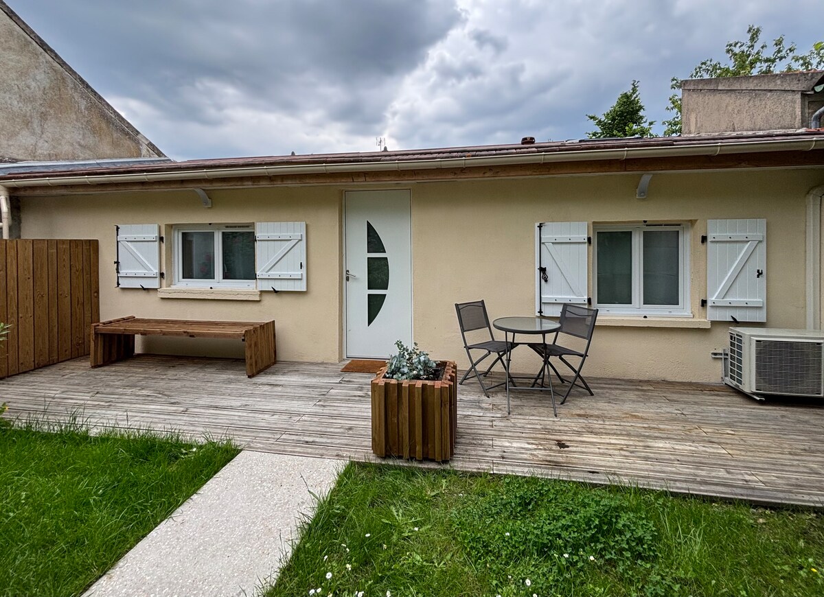 在我們花園的後面,獨立住宿設有露台(一個在住宿前面,一個在住宿後面)和花園通道。 設備齊全的廚房(冰箱冷凍庫、微波爐)、客廳配有Rapido沙發床可供睡覺、浴室配有步入式淋浴間和馬桶。 每個空間都以一扇法式推拉門隔開,以尊重每位住客的寧靜。在這個安靜而時尚的空間放鬆身心。