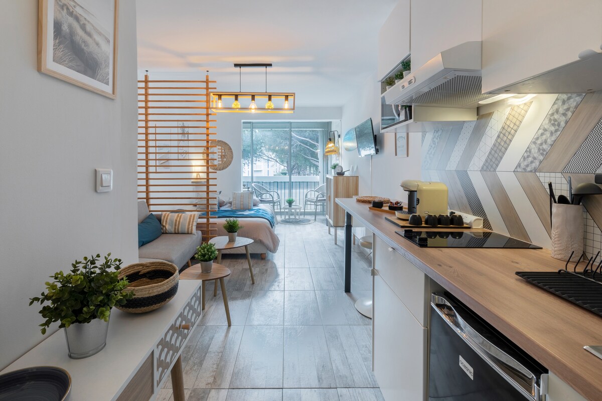 舒適的 26 平方公尺單間公寓,步行 8 分鐘即可抵達海灘和市中心。 非常適合 4 位成人和 1 位嬰兒的家庭度假。 安靜且設備精良的住宿: - 4 張舒適的床、折疊嬰兒床、高腳椅、適合嬰兒使用的餐具、 - 洗衣機、洗碗機、微波爐、咖啡機、水壺、烤麵包機、電視、空氣炸鍋 - 更衣室、許多儲物空間、私人停車位、獨立入口。 完美的環境,讓您度過美好的假期。