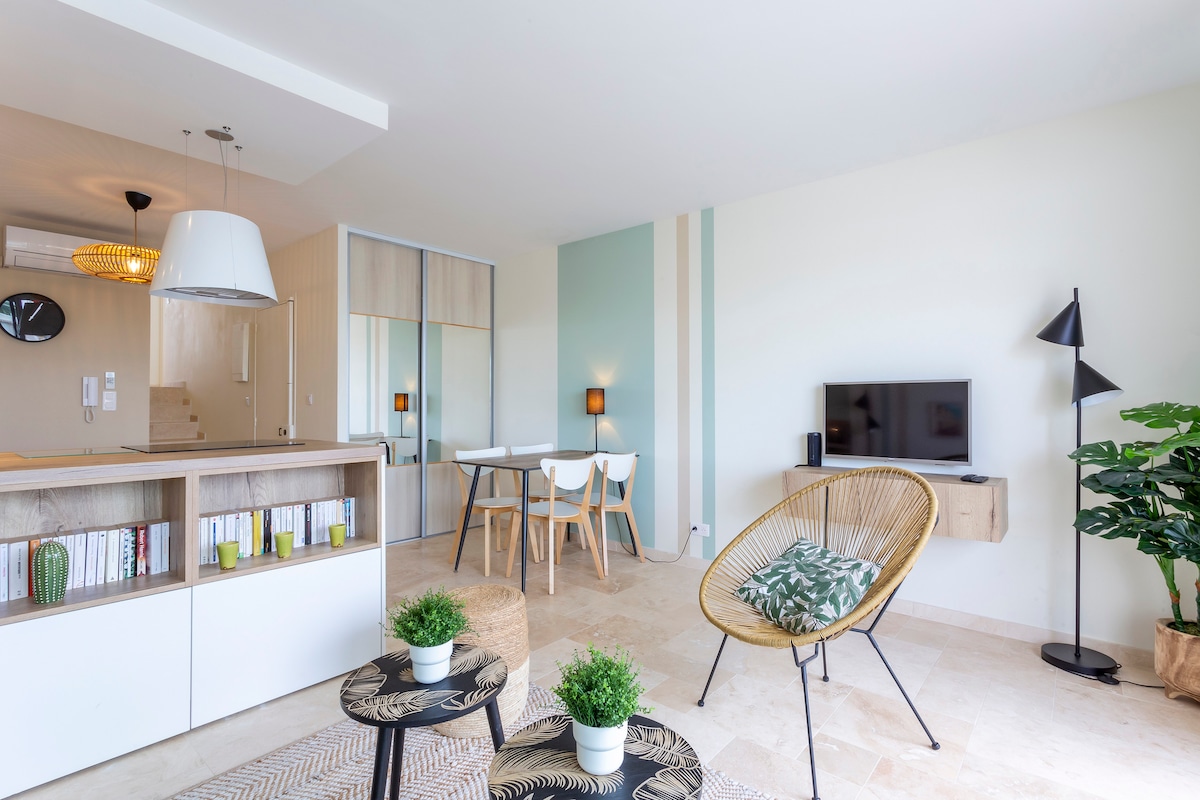 ✨ 🌴舒適的公寓,有露台和海景✨ 靠近海灘的放鬆住宿(步行2分鐘即可抵達,無需穿越道路)! 22平方米的公寓完美地佈置了兩個獨立的空間—白天和夜晚—以增加舒適度。 您會喜歡: •住宅🚗和單車的私人泊車位 •安全的草坪露台🌿 •步行即可抵達商店和餐廳🍹 小小的繭,是安靜假期的理想之選,介乎海洋和放鬆之間 💛