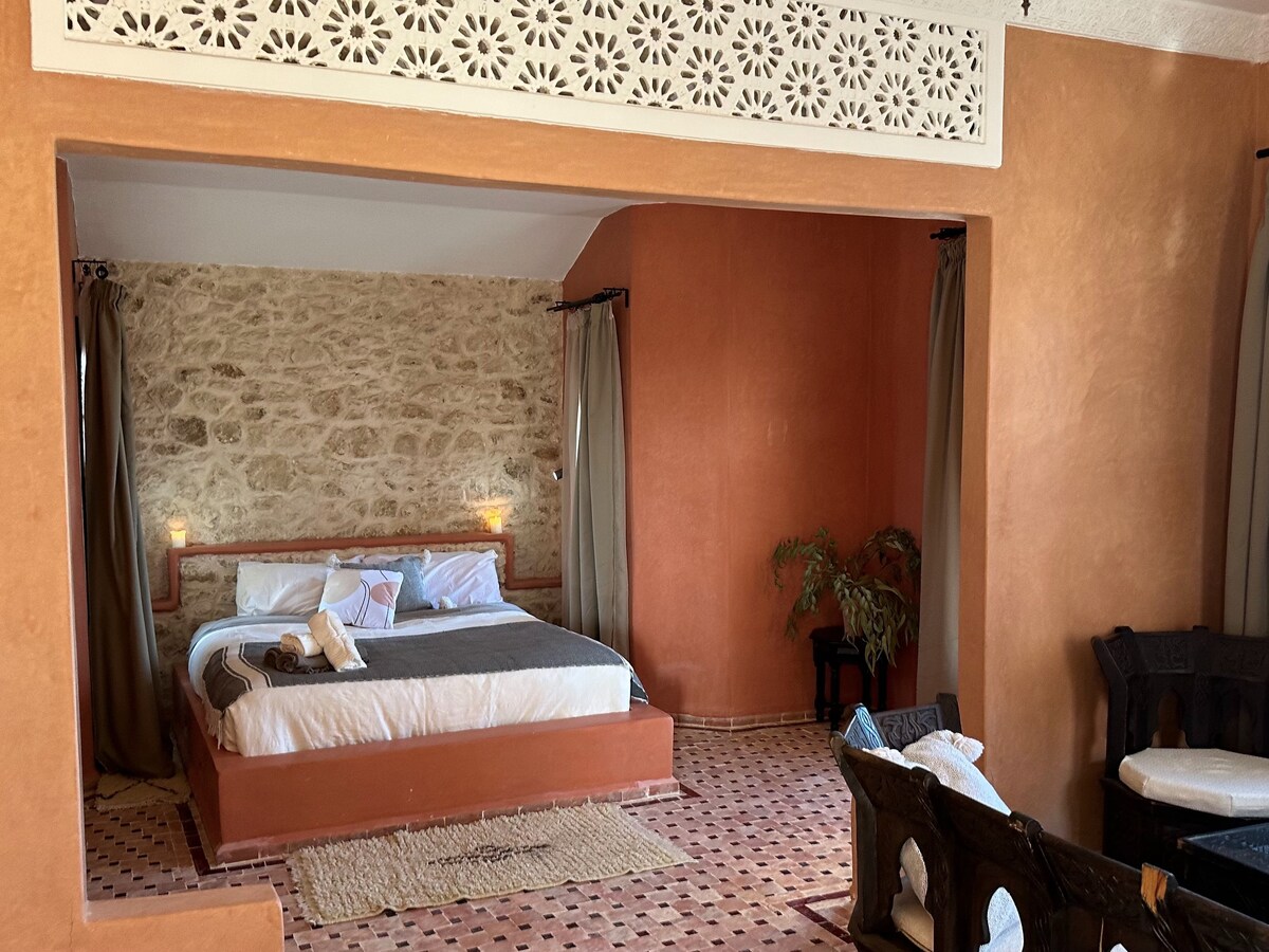 Riad d'exeption, au calme, juste restauré, aliant poésie et charme. Au 1er étage, un vaste appartement se compose de 2 Junior Suites avec salle de bain en Tadelak et du Patio-Salon avec une fontaine. Cuisine privée. Sur le toit, une grande terrasse où à l'abri du vent et du soleil, berçé par le bruit des vagues et le ballet des mouettes vous êtes dans la magie pure d'Essaouira... Vue sur l'Océan et la Médina !