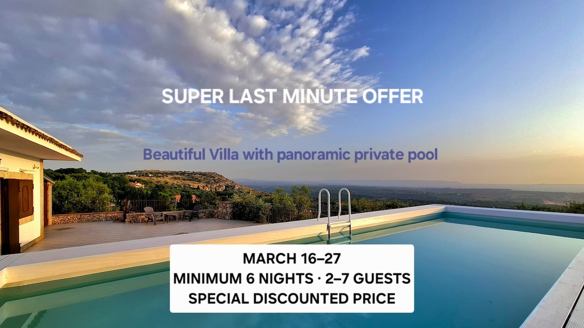 在這座坐落在大自然中,擁有壯麗景觀的別墅中,享受一次難忘的體驗。 您可以在大型全景陽臺上用餐,在松樹林中放鬆身心,點燃燒烤爐、烤箱和壁爐,或潛入美麗的全景泳池。 配備所有舒適設施,提供高速 Wi-Fi 和無限 GB,2 台多語言智慧電視,可收看 Netflix 和 Amazon Prime。 距離海灘僅幾分鐘車程,距離錫拉庫薩和諾托20分鐘車程,距離卡塔尼亞機場40分鐘車程。