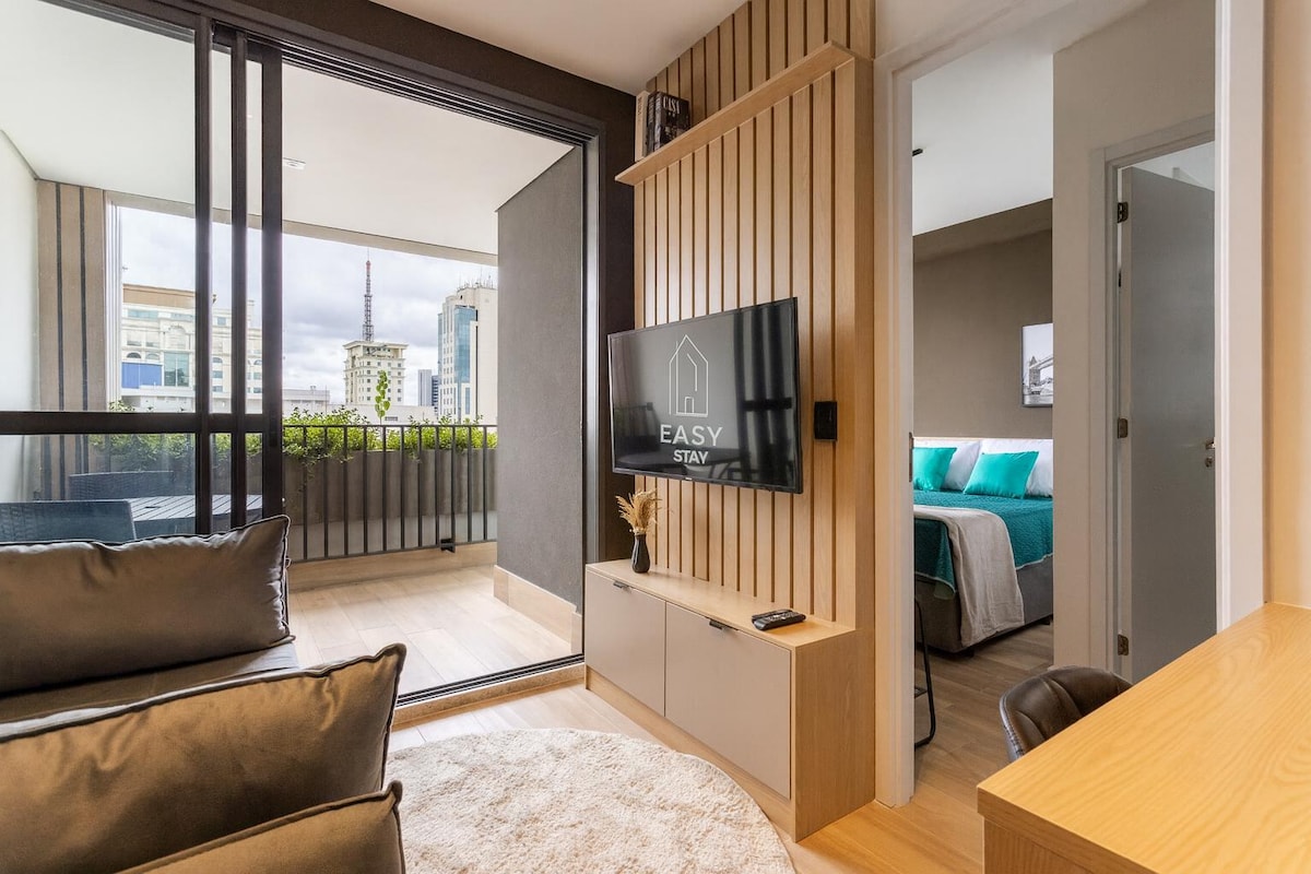 獨特的空間。享受真正的保利斯塔納體驗!44平方公尺的公寓, 1間配有雙人床的臥室(隔音窗)、配有65英寸電視的客廳、WiFi、廚房、新裝修的公寓、陽臺、免費停車位、靠近幾個商場、便利商店、美妙的餐廳、位於聖保羅最酷和最著名的街區、靠近地鐵( 400公尺)、Av Paulista的美麗景觀。最多可容納3人(客廳沙發床1人)。24小時接待處。