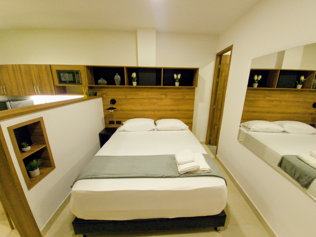 在參觀美麗的卡利市時,感受如家一般的舒適。這是一間豪華套房,配備您享受愉快時光所需的一切,位於安靜的高級社區,非常中心,步行即可抵達Parque del Perro。我們非常關注每一個細節。在這裡,您可以找到全套廚房、1間全套浴室、小型辦公空間,還有熱水可供放鬆淋浴。智慧電視可供娛樂、WiFi等。我們真的希望您能感到賓至如歸!