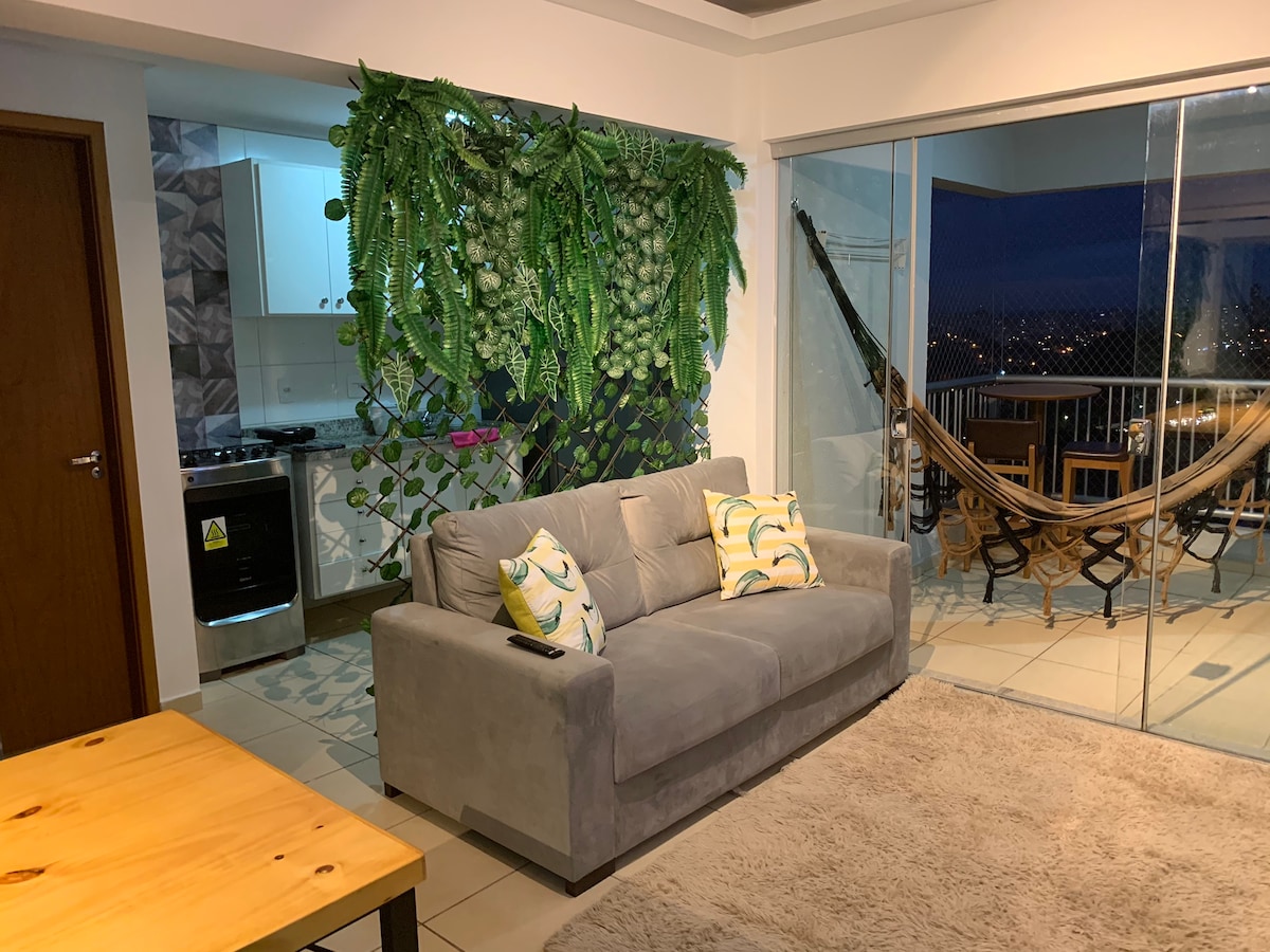 全新公寓, 11樓有2間套房,超級舒適,毗鄰耀眼的公園、超級安全的建築,毗鄰糖果超市、Goiânia最貴貴的地區、Netflix登入式無線網絡、55英寸智能電視、空調、餐桌、帶烤肉的陽臺、Bistro、吊牀和最美麗的城市景觀。