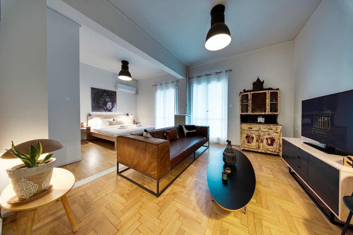 舒適和現代的氛圍,位於19世紀的房子中。 這棟房子位於市中心安靜的街道上,步行5分鐘即可抵達考古博物館,位於地鐵附近的波西米亞社區。可容納2-4人。 它可以通往非典型的雅典後院和lemontree。