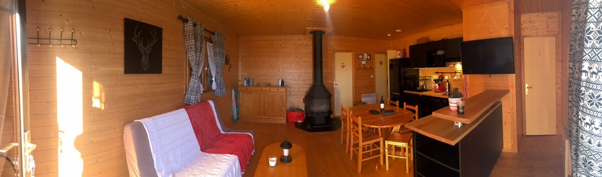 24 平方公尺的半獨立小木屋,附帶 7 平方公尺的露台,坐落在一片美麗的樹林中。非常適合 4 名成人和 2 名兒童入住。 請注意,最少租用 2 晚。 設備齊全,我們的禮賓人員將熱情歡迎您! 步行 2 分鐘即可抵達保齡球館、酒吧、遊戲室、餐廳、超市,距離滑雪場 400 公尺!您還可以找到許多步行或騎自行車的路線! 小屋非常適合與家人共度美好時光。我們期待著您的到來!