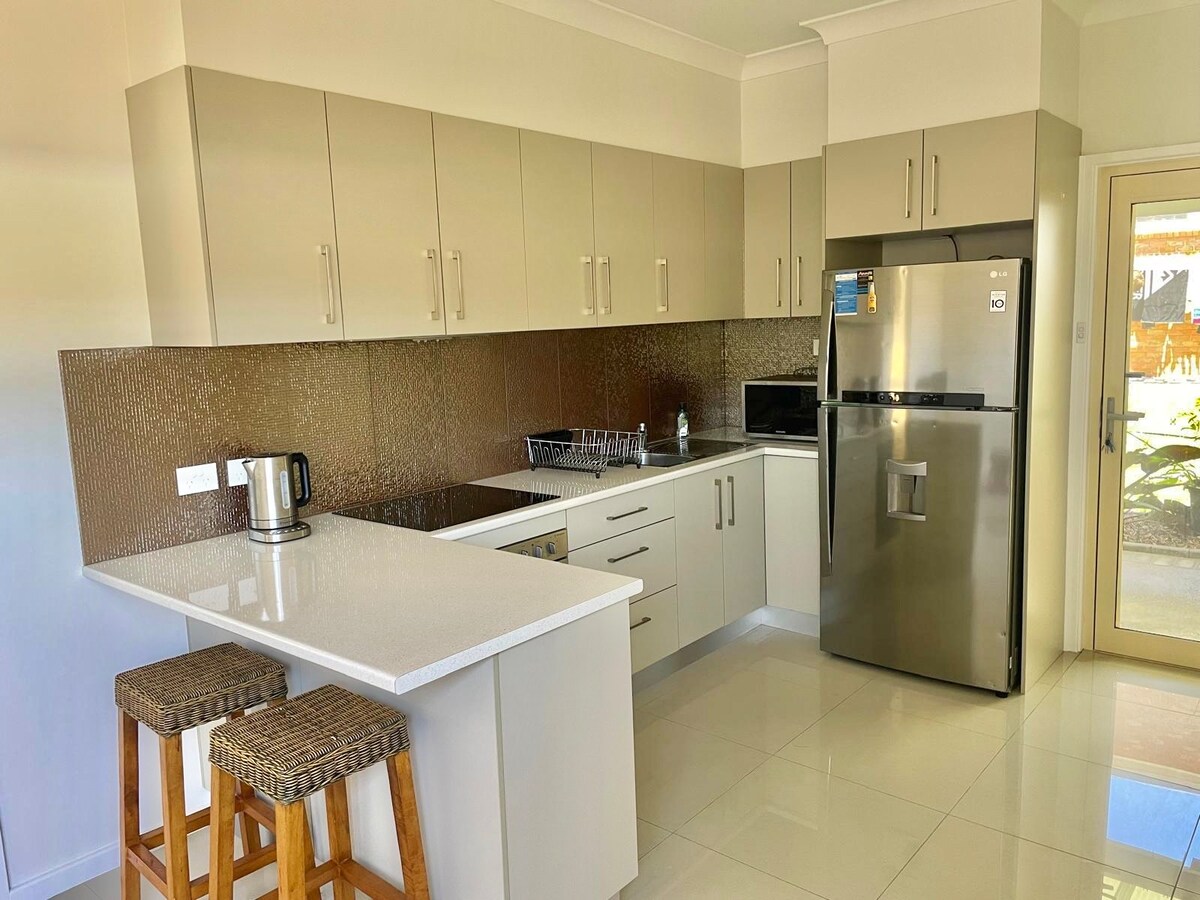 全新豪華一樓單間公寓,車庫有安全的安全的停車位。適合情侶、單身人士和商務差旅人士。步行不到5分鐘即可抵達北伍倫貢海灘。在海洋游泳池散步或游泳,在斯圖爾特公園跳傘,或在海灘上放鬆。參觀附近的許多咖啡廳、酒吧和餐廳。安靜度假或長期住宿的完美基地,同時享受輕鬆的氛圍。