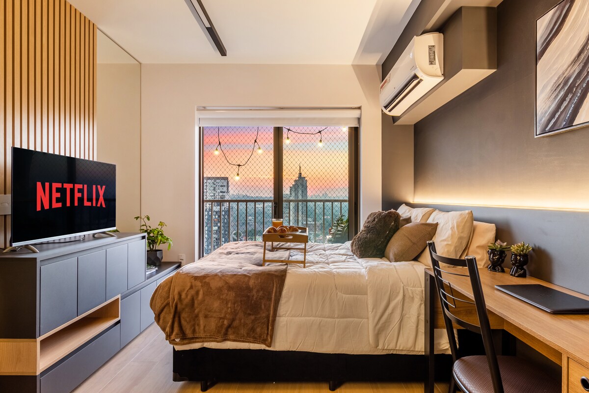 美麗的單間公寓,陽台上可欣賞美麗的城市景觀,非常完整和規劃。 保險,提供24小時全天候的禮賓服務。 入住距離Faria Lima地鐵最近的建築物22樓,距離Av. Paulista。舒適實用、加大雙人牀、全套牀單、2螢幕27英尺辦公室、高速WiFi、設備齊全的廚房、60英尺電視、強大的淋浴間和餐桌。 大廈內設有:按摩浴缸、共享辦公室、24小時健身房和洗衣房。 市場和很棒的酒吧就在附近!