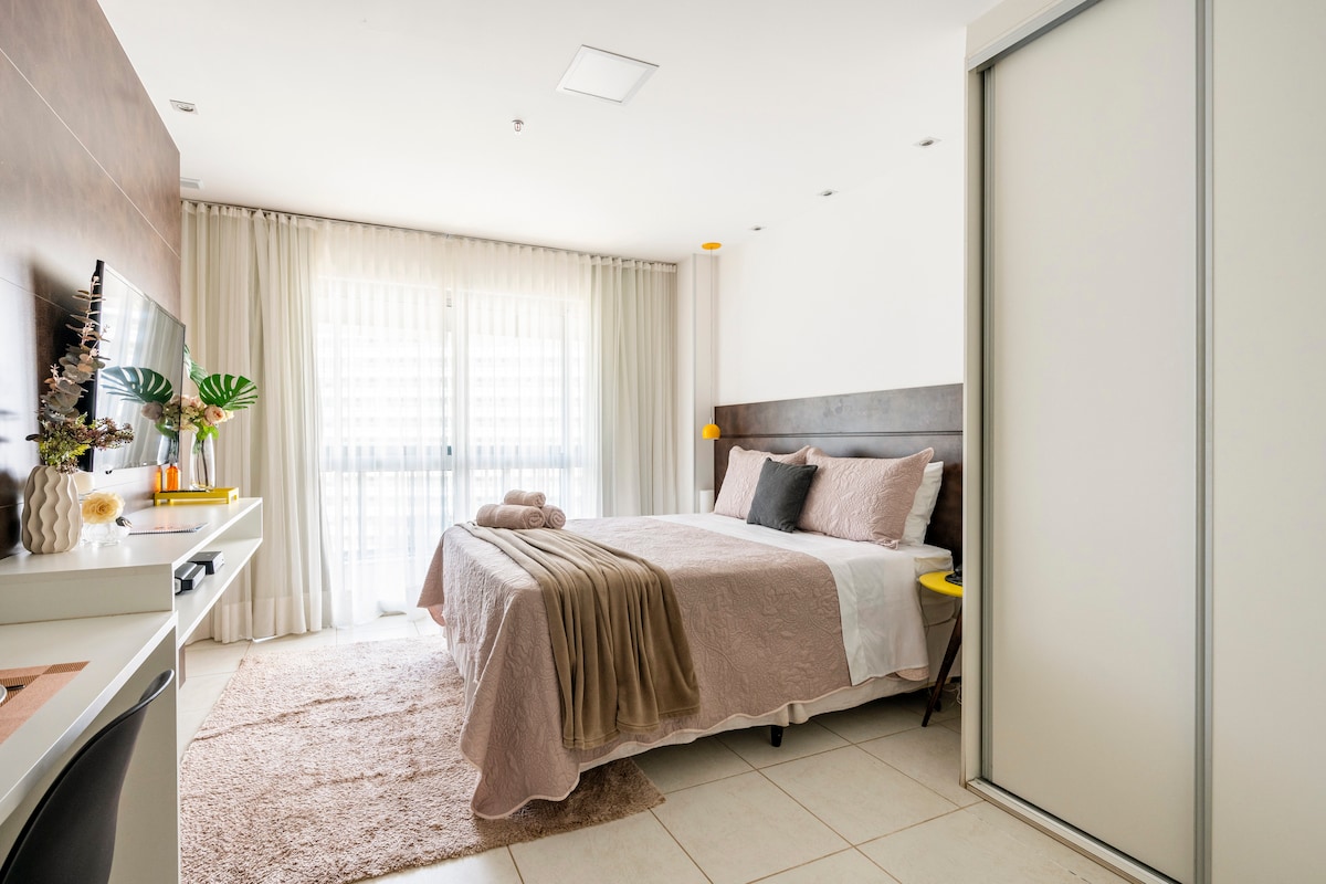 At the Cullinan Hplus Premium hotel. Very new and contemporary. Amazing location! Two malls across the street. Great tourist spots to go on foot. Charming, finely decorated and furnished unit. On the highest floor, with a beautiful view of Brasília and Asa Norte. 29m² luxury suite with king bed. Well equipped with several items for your convenience. Acoustic insulation on the windows for a great rest. Smart TV. Garage. Swimming pool, gym, sauna and restaurant. Check in 24 hours at reception.