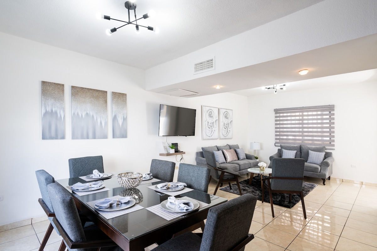 這個獨特的房源有足夠的空間與親朋好友一起享受安靜的住宿體驗。 設計舒適,有很多空間和配件,讓您有賓至如歸的感覺,配有網路、電視、沙發牀、寬敞的住宿和兩間臥室。 靠近美國領事館、高爾夫俱樂部和醫院等景點。 底部有超市、自助餐廳、加油站和銀行。 入住超過5晚,即可獲得一瓶迎賓葡萄酒!