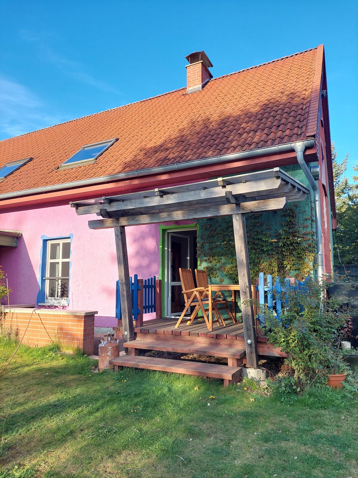 坐落在天然公園Sternberger Seenland ,梅克倫堡-西波美拉尼亞( Pomerania ) ,坐落在草地和森林之間非常安靜的僻靜地段。 由木頭和粘土製成的簡單裝飾的小屋站在前農舍旁邊,今天是房東的房子。