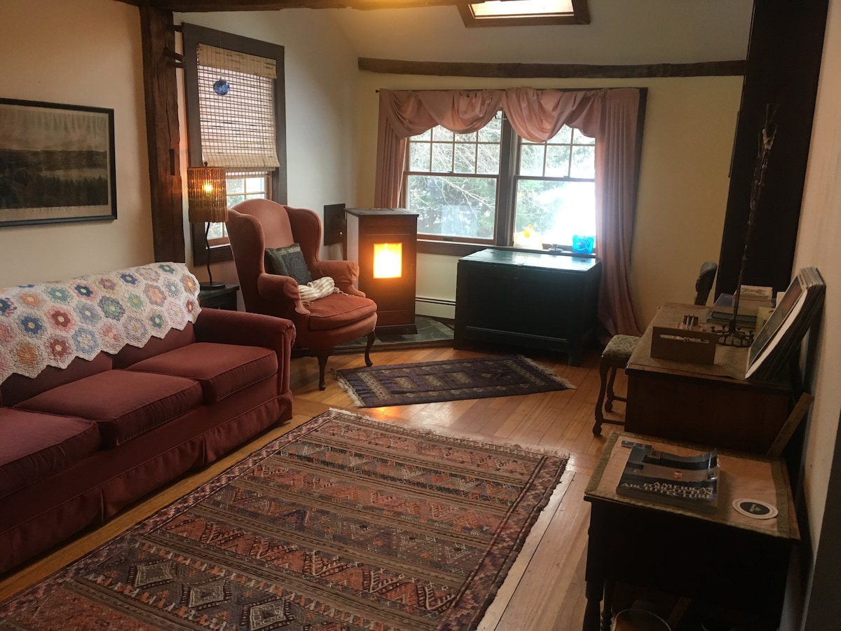 公寓安靜、乾淨、舒適,面積400平方英尺,配備全功能廚房。浴室配有淋浴間/浴缸。廁所是一個獨立的堆肥單元。就寢區有一張非常舒適的雙人床。這是個農場。公寓附近有機械和農場相關設備。您可能會在白天聽到和看到機器移動。公寓有2個入口,它自己的露臺和一個穿過附加的穀倉,我在那裡存放一些小型設備。