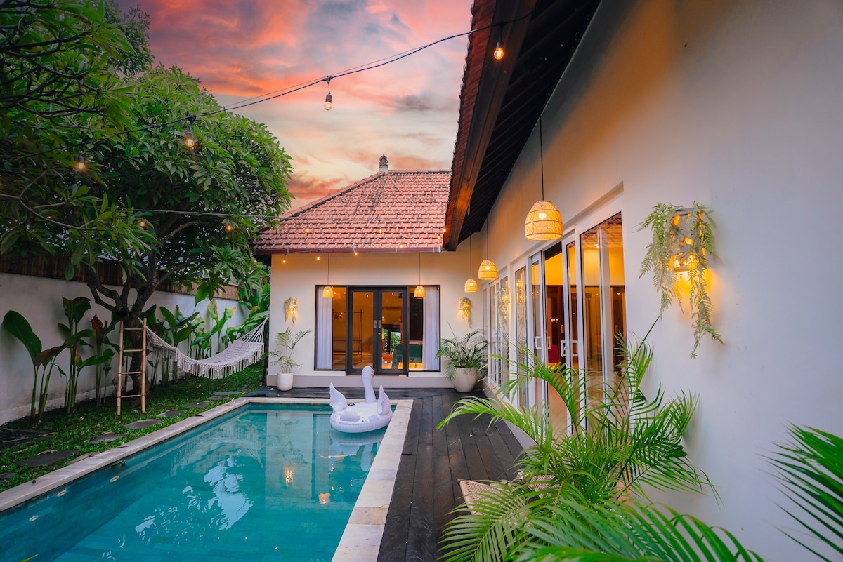 別墅坐落在水明漾(Seminyak)和坎古(Canggu)之間迷人的熱帶別墅區,佔地150公尺,步行4分鐘即可抵達日落海灘,有許多可愛的咖啡廳和海灘俱樂部。別墅提供每日清潔服務、早餐、配有日光浴床的私人泳池、大型起居區、設備齊全的廚房、配有浴缸和室外淋浴間的露天浴室。