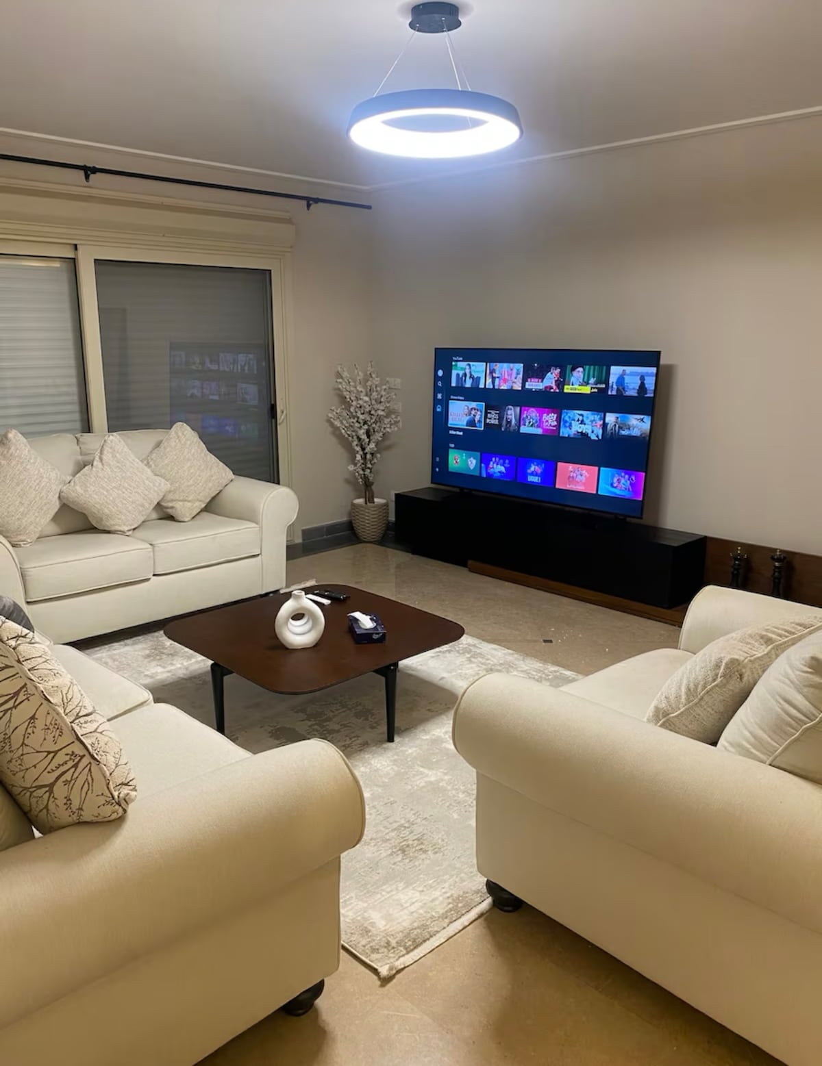 Welcome to our modern 3BR (200 sqm) hotel apartment by West Somid Developments! Designed for families, groups & professionals. Enjoy 5G Wi-Fi, 4 smart TVs, electric shutters & new furniture. 24/7 security, guest lobby, food delivery & optional cleaning. Guests can also enjoy a shared rooftop lounge — great for movie nights, relaxing evenings & family time. Just minutes from Mall of Arabia & top Zayed spots! ما نقدر نستضيف أي ثنائي عربي غير متزوج في نفس الشقة.