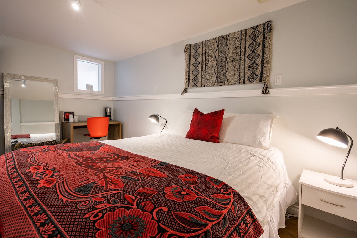 歡迎來到我們的550平方英尺永續建造的中世紀獨立單間公寓套房。 步行前往市中心(30分鐘)、騎自行車10分鐘、搭乘巴士15分鐘。距離最好的當地麵包店和泰國美食僅幾分鐘路程。 *如果你很高,這間套房可能不適合你!保留了100年的樑,有些地方高度為1.75公尺(5英尺10英寸)。 *這是一個無化學品和無香味的房源。請在預訂前同意我們的《房屋守則》。 我們是LBGTQ +支持者,是一個包容膚色和信仰的家庭。