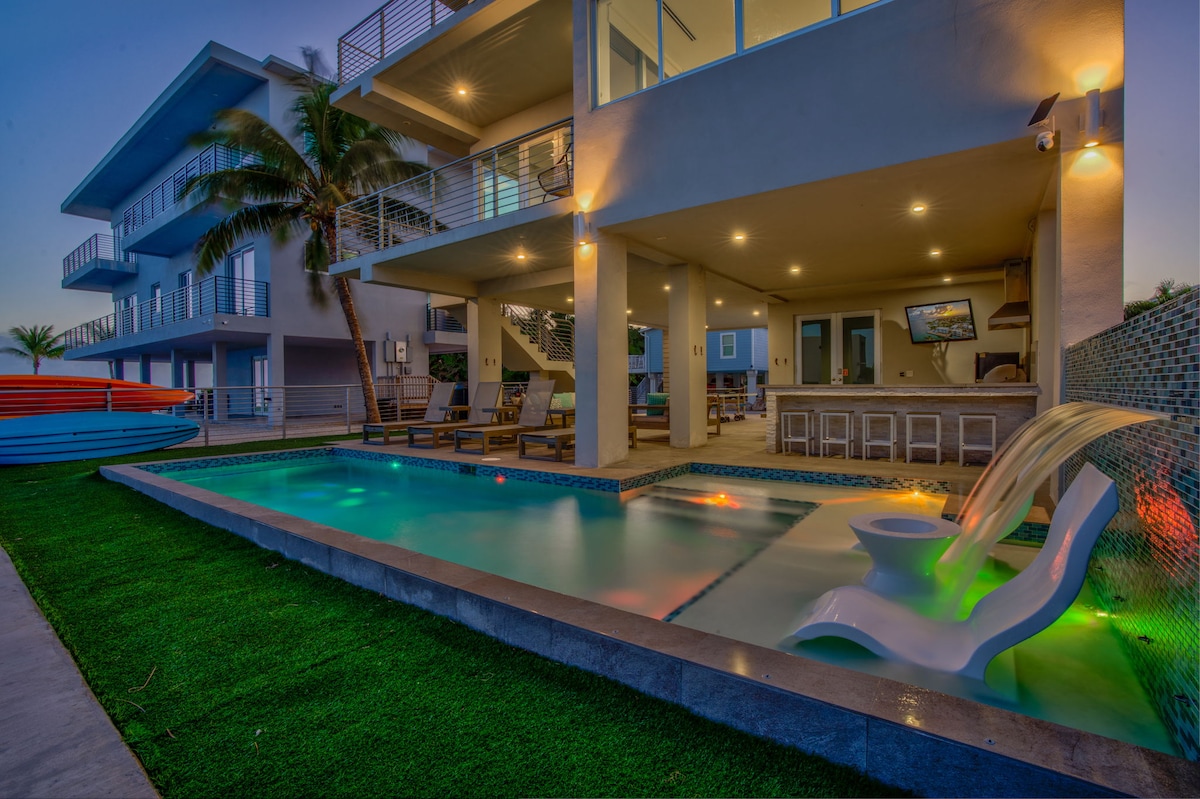 歡迎登上Captains Rooftop,您的4BR屋頂露台熱水浴缸綠洲,可直接通往海洋運河,有75英尺的碼頭。 這間三層高的屋頂房源為您的整個家庭提供獨特而難忘的佛羅里達礁島群體驗。 🏊♂️ 2個豪華噴射按摩浴缸(一個在屋頂,一個在後院) ⛵ 私人75英尺碼頭,周圍環繞著紅樹林叢林 🕹️ 桌上足球 🍳屋頂露台,配備燒烤架和開放式海景餐廳 💻 高速 Wi-Fi,適合串流和遠程工作 🛏️ 舒適