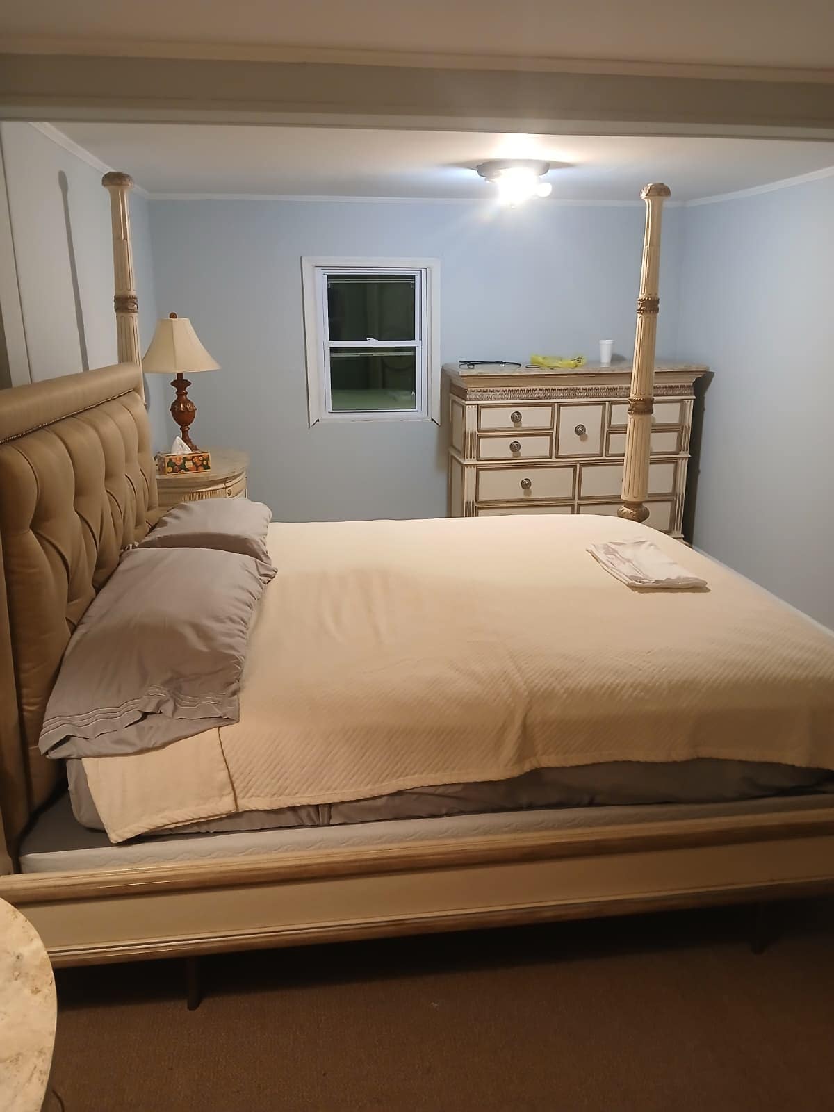 This stylish bedroom offers the perfect blend of comfort and elegance. Featuring a plush king-sized bed with soft linens and pillows, it’s designed for relaxation. The elegant, tufted headboard and tasteful furniture add a touch of luxury to the space. A spacious dresser and large window fill the room with natural light, creating a peaceful atmosphere. Ideal for a quiet getaway or a longer stay, it’s a serene retreat where you can truly unwind.
