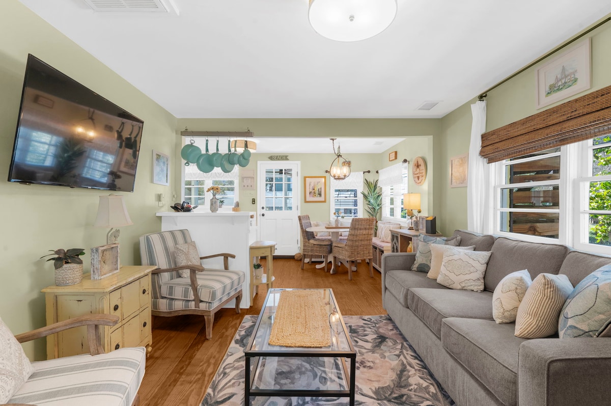 查爾斯頓最近的海灘上的一間臥室公寓!距離查爾斯頓市中心15分鐘路程,距離大海500步之遙。 富麗海灘市有許多寵物友好型餐廳、狗狗公園, 10月至4月期間允許狗狗上海灘。 主臥室設有加大豪華床,客廳設有標準拉出式梳化和兩張特色椅。 客廳有50英寸智慧電視。 小廚房配有洗碗機。可使用套房內的洗衣機/乾衣機(與一位鄰居共用)。