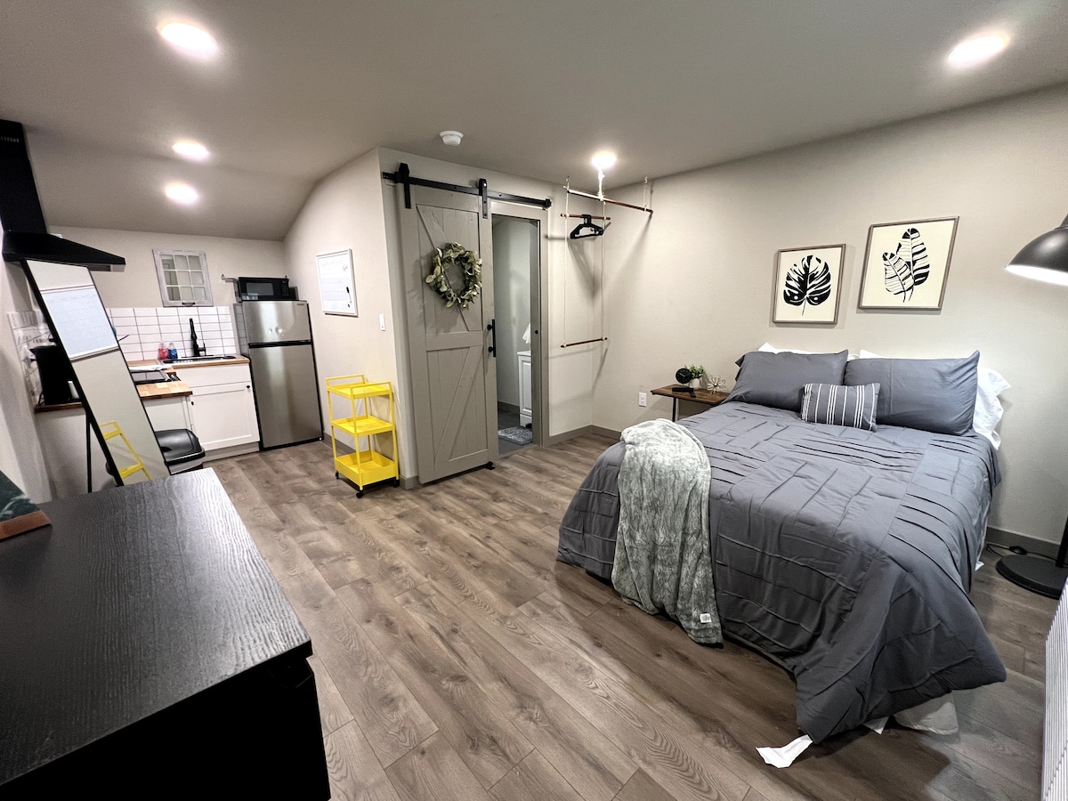 This is a newly remodeled apartment above a three car garage with its own private entrance. It has a great King Size bed with soft sheets and comforter. The kitchen is well stocked with dishes and all the essentials that you will need for your stay. Bath has a tub/shower combination with soft towels and all the essentials in the bathroom. The kitchen has granite counter tops and stainless appliances. Huge walk in closet. TV in Bedroom and Living room. Internet provided.