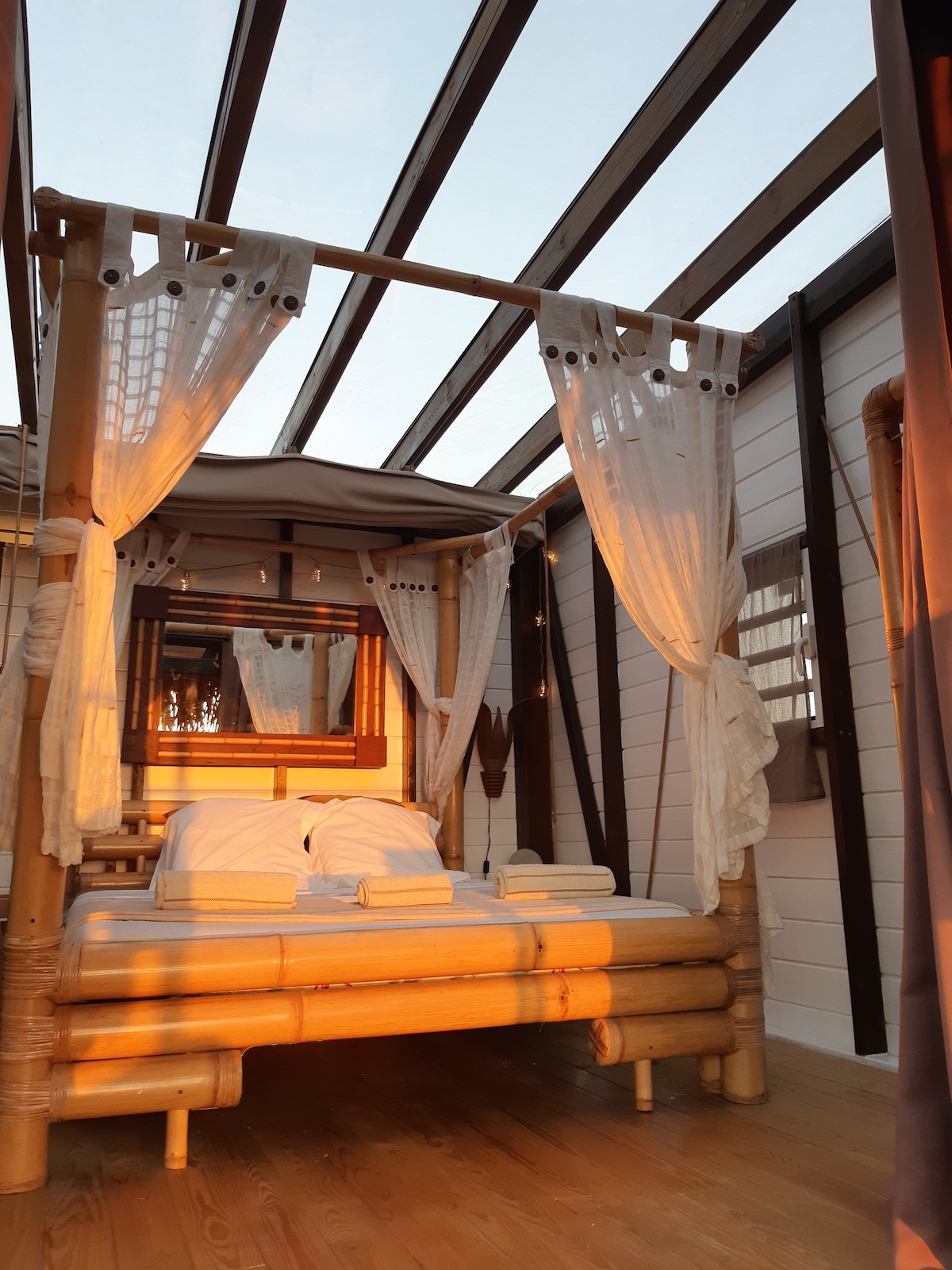 Un toit transparent pour observer ,les étoiles et la lune , une vue sur un jardin luxuriant depuis votre jacuzzi privé. Le Moon Lodge est un cocon romantique avec un accès direct à un toit panoramique, idéal pour admirer le ciel nocturne ou bronzer au soleil. voile ombrage rétractable chambre climatisée