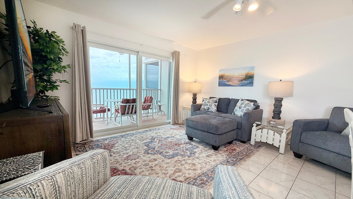 🌴 歡迎來到島嶼時光! 這間明亮的10樓3床2浴室海濱公寓位於Fort Myers Beach安靜的南端,可欣賞史詩般的海灣景觀和令人驚嘆的夜間日落。 在有築牆的陽台上喝咖啡,漫步在木板步道上,或潛入溫水泳池和水療中心。 步行前往聖提尼別墅廣場,乘坐電車前往時代廣場,或探索情人島、聖尼貝爾島、卡普蒂瓦島和拿坡里島,你的海岸探險從這裡開始!