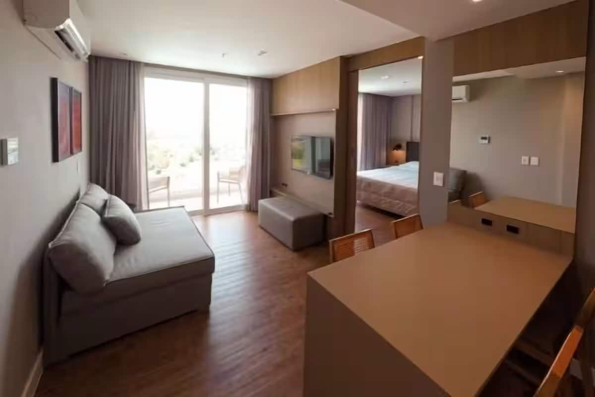 Modern 120 m² apartments for up to 10 guests, in downtown Foz do Iguaçu. Comfort, technology, and 24/7 reception. Fully equipped kitchen, private barbecue, air conditioning in all rooms, and free parking for 2 vehicles (with reservation). The condo offers complete leisure: pool, heated jacuzzi, sauna, gym, kids’ room, game room, coworking space, beauty salon, and 24/7 market.