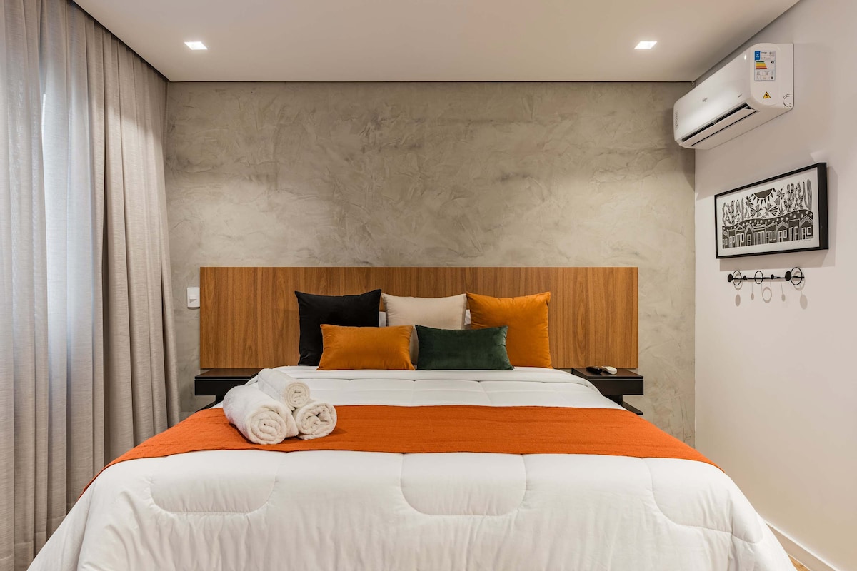 時尚的50平方米公寓,位於Bela Vista,有24小時門衛。2間臥室(只有1間配有空調和標準雙人床,第二間臥室很小,可以用作辦公室,配有雙人沙發床)和1間浴室。 從每扇窗戶都可以欣賞到美景,是工作和放鬆的好地方。 陽台的私人噴射機是欣賞城市景觀的好地方。 非常適合尋找舒適、便利和城市最佳景觀的情侶、專業人士或小家庭。
