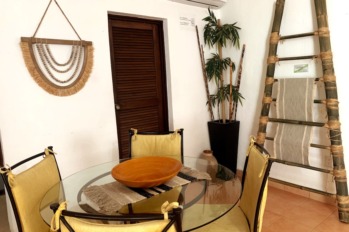 Large 1 bdr apartment Close to beach! “Amazing, quiet, a true hidden gem”, per previous guests. Quiet Large 1 bedroom private apartment, queen mattress, satellite Wifi. AC. Self checkin. Beautiful terrace, & palapa with Yucatan hammocks in tropical jardin. Close to beach - just 2 min walk through palm trees! Your private eco apartment, with queen bed, nice linens, & wooden French double doors to a large terrace. Bar kitchenette. Welcome Basket with free first morning’s coffee!