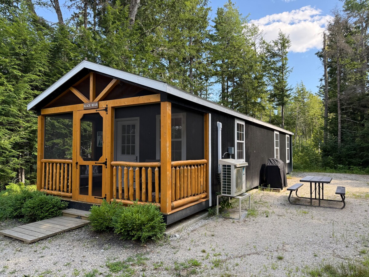 "Bear" cabin is one of four new cabins at Dickens Farms in Eastbrook Maine. Our cabins are spaced for privacy and each has its own fire pit, bbq grill and picnic area. You can enjoy water access to Abrams Pond for swimming, fishing, and kayaking. Two kayaks are provided per cabin for your enjoyment. Sit in the screened in porch and listen to nature or head into Acadia National Park to explore. Bike along the private road. Relax with your family for a quick getaway or week long adventure.