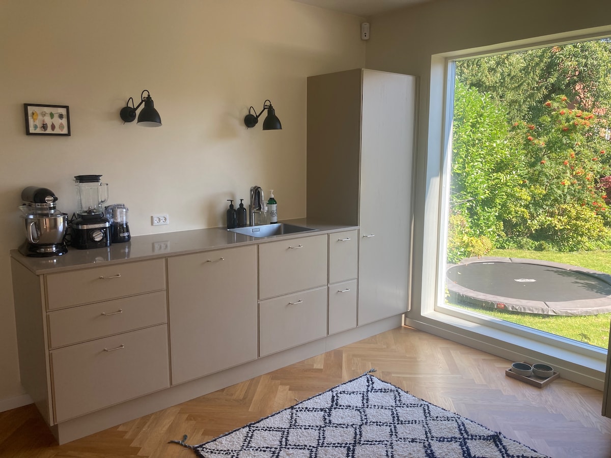 在這個寧靜的家中與全家人一起放鬆。 這間新裝修的公寓位於一個風景優美的住宅區,有自己的入口和私人露台。 2間大房間,配有雙人床,客廳的沙發床可供2人使用。配有淋浴和洗衣機的廁所,以及配有洗碗機等設備的廚房。 步行150公尺即可抵達海灘,350公尺即可抵達美麗的草地和舒適的森林。 步行即可購物,開車30分鐘即可抵達哥本哈根市中心