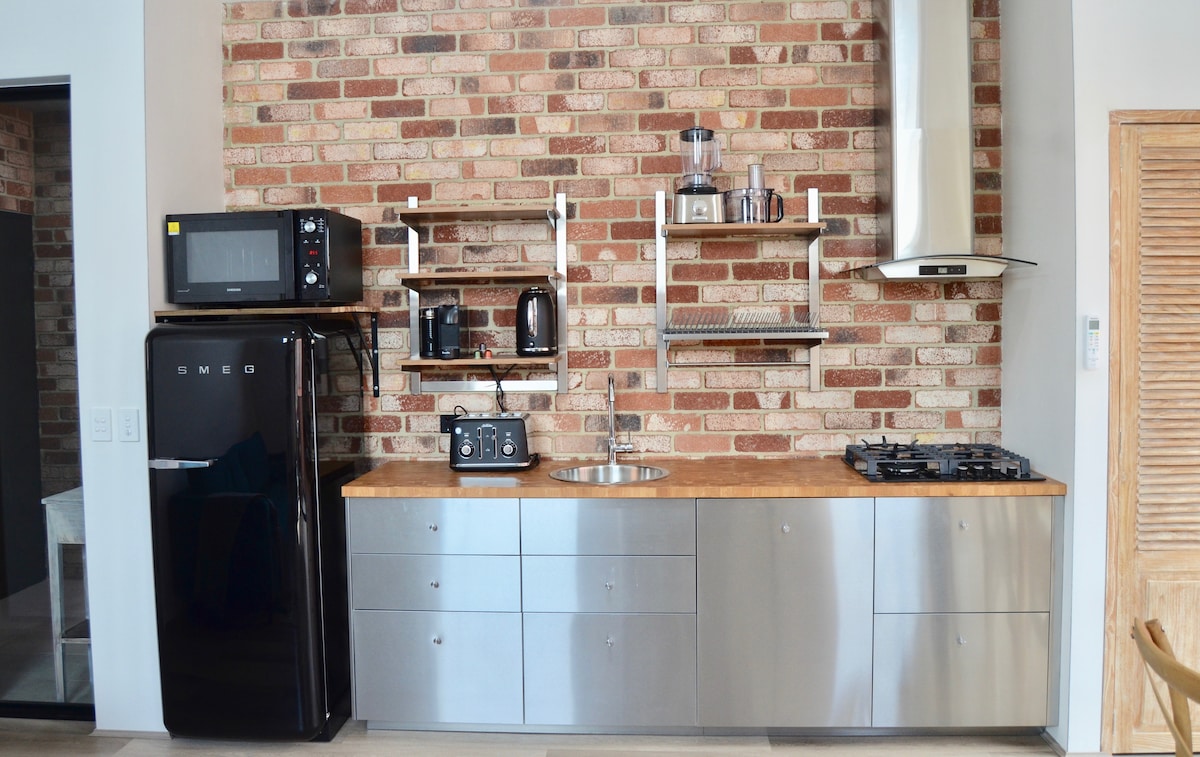 獨立的單間公寓清新明亮,配有精良的廚房,配有微波爐、瓦斯爐和迷你烤箱。提供基本早餐。浴室緊湊,配有淋浴間、加熱毛巾架和吹風機。單間公寓配有反式循環空調、網路、配有Netflix的智慧電視。它與房子分開,並且您的隱私得到保障,因為1.8公尺的圍欄將兩者分開。單間公寓前面就有您自己的起居區域,配有烤肉設備。