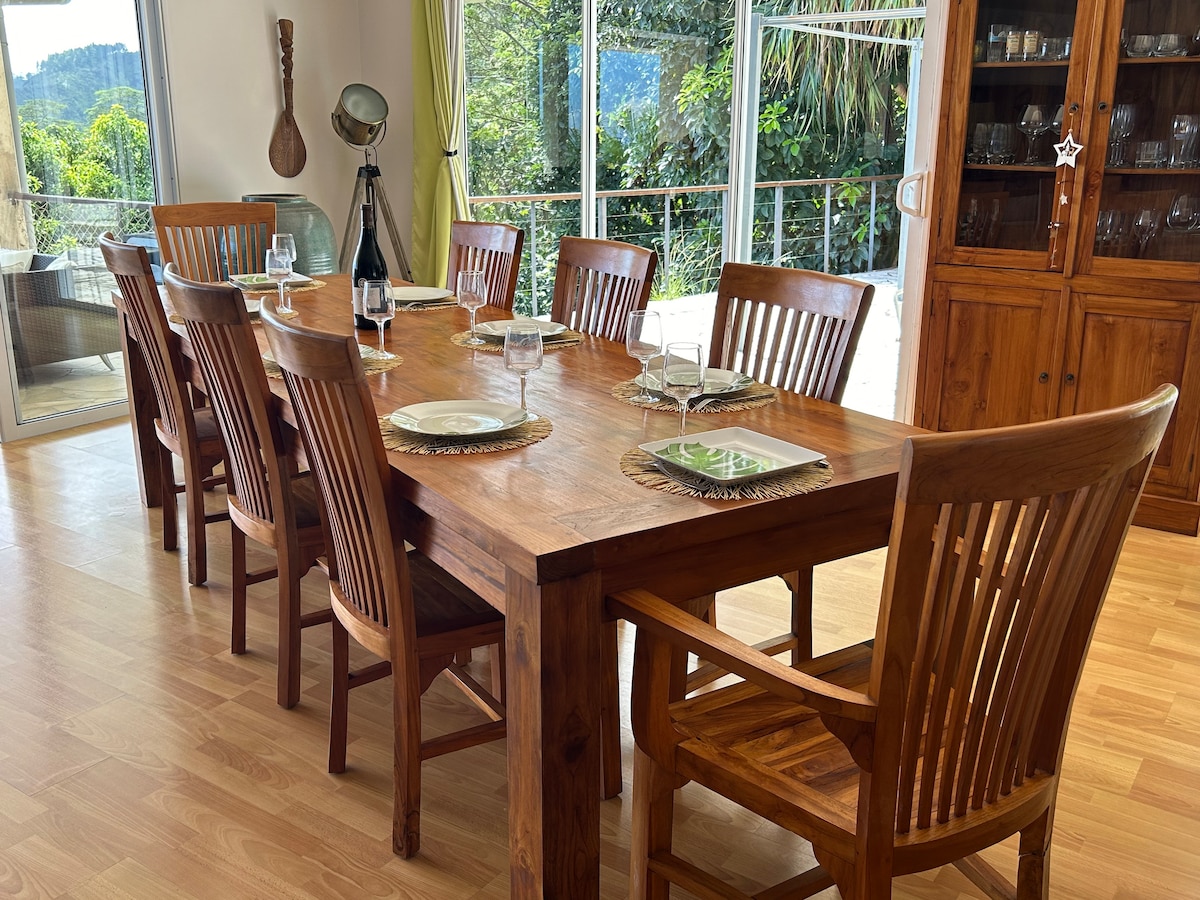 Détendez-vous dans ce cottage tropical, en montagne, à 500 m d'altitude, à 30 mn de l'aéroport, avec une vue unique à Tahiti sur le lagon et Moorea, dans une résidence très calme 2 chambres climatisées, avec 2 télévisons, internet, pour 5 personnes avec soit 2 lits king size et 1 lit simple ou 1 king size et 3 lits simples. Deck, piscine, BBQ Cuisine avec lave vaisselle, micro-onde, bar, four, cuisinière à gaz 1 Salle de bain, sèche cheveux, lave linge+sèche linge, fer à repasser