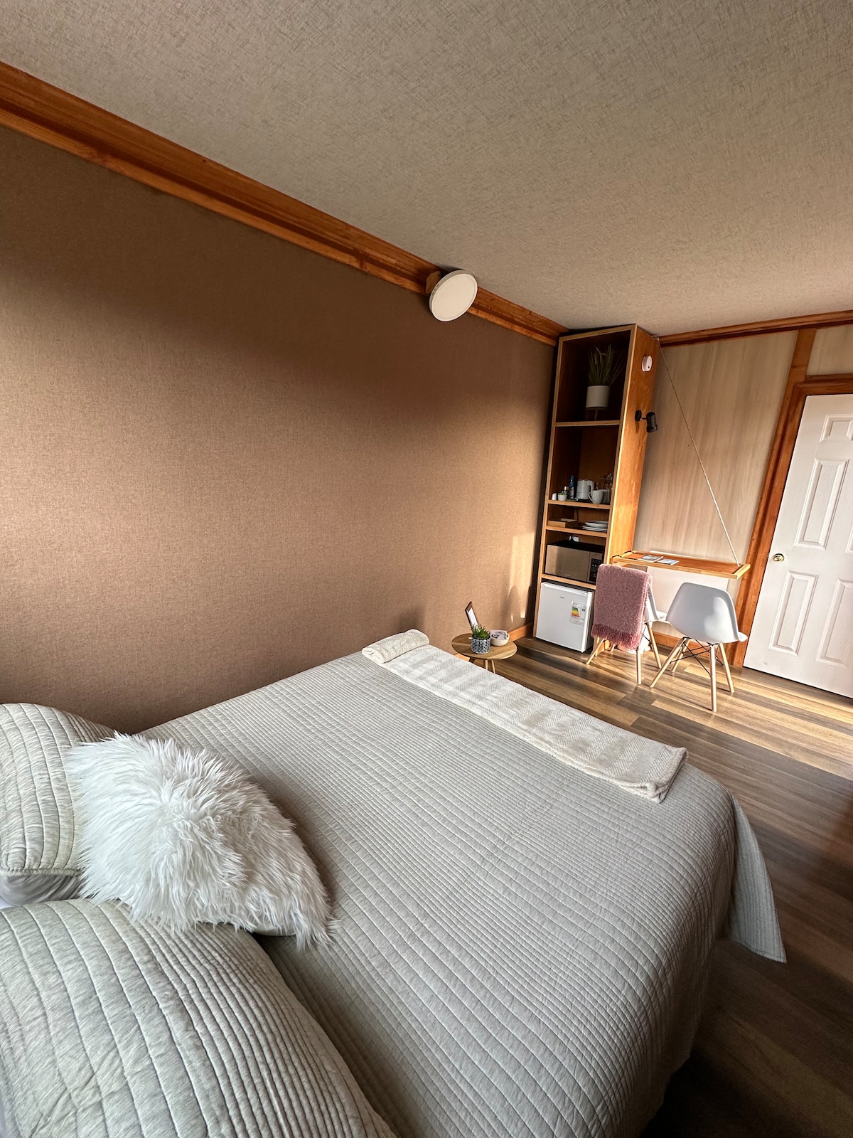 Bienvenido al sur de Chile, cercano a la ciudad de Puerto Varas, a tan solo 7 kilómetros por Ruta 225 Camino a Ensenada, podrás gozar del Lago Llanquihue y su hermoso paisaje natural de bosques y volcanes. Te recibimos en una cómoda y rústica Tiny Home completamente equipada para una pareja. Aprovecha el acceso directo a la playa y atrévete a navegar en kayak o pasear en bicicleta por la Ruta Escénica Lago Llanquihue.