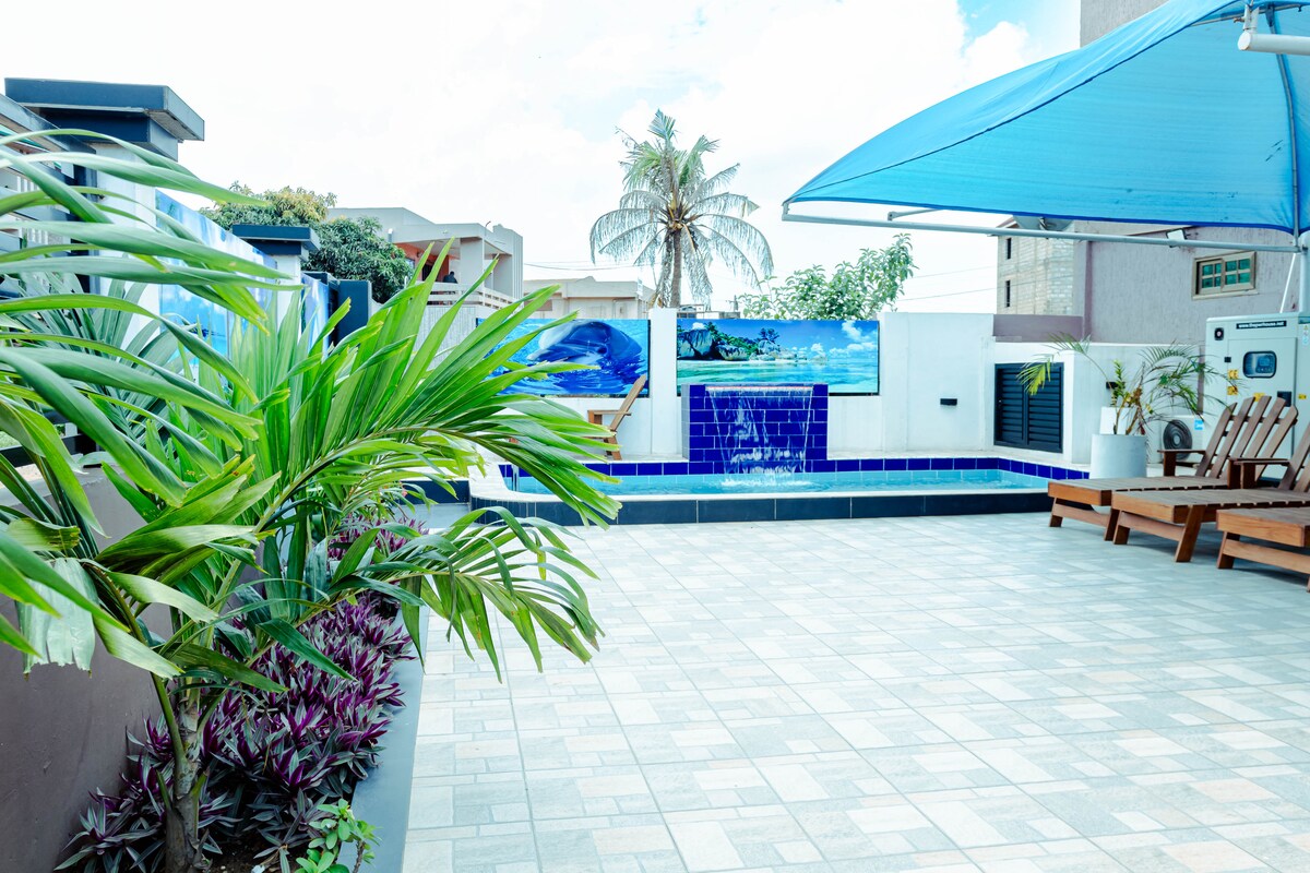 Welcome to your upscale urban getaway in the city of Accra! With a stunning view of the Aburi mountains, only a few minutes drive away or 15 minutes walk. Under 12 miles from the airport, straight on the M4 with no turns. Our two-bedroom apartment offers joy & comfort with 24/7 security, 24/7 electricity & water, with exclusive amenities, such as a pool, rooftop terrace, modern gym, full kitchen, wifi, barbecue, and more that will make your stay truly unforgettable.