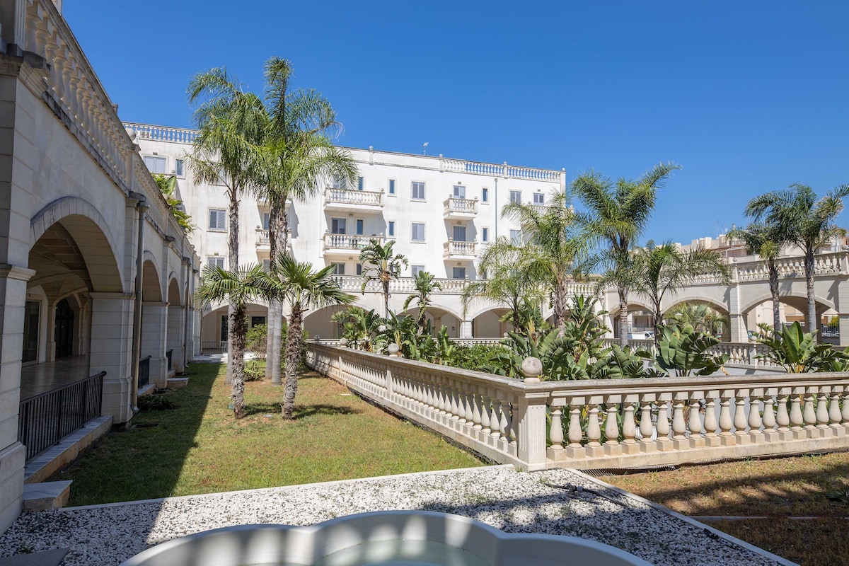這間公寓以及其他四間公寓構成了一棟庭院房屋,這是一棟歷史悠久的薩倫託建築,配有帶水力按摩泳池的庭院。 Le Cimbe是放鬆身心的樂趣。 我們位於安靜的Racale鎮,可俯瞰Ionian Sea及其碼頭Torre Suda ,距離Lecce、Gallipoli、Leuca、Otranto幾公裏。