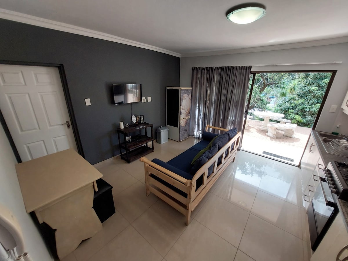 Cottage under our house with a small kitchen bedroom and bathroom. It is a self catering unit with bar fridge, micro wave oven and 2 plate stove with oven and kitchen cutlery and utensils. We have 2 small dogs a Yorkie and Jack Russell. There is a braai facility and a large swimming pool. Tv and wifi available. House is surrounded by a beautiful tropical garden and is quiet and peaceful. We are about 1000 metres from nearest beach. Open parking facility available. Infants and children allowed.