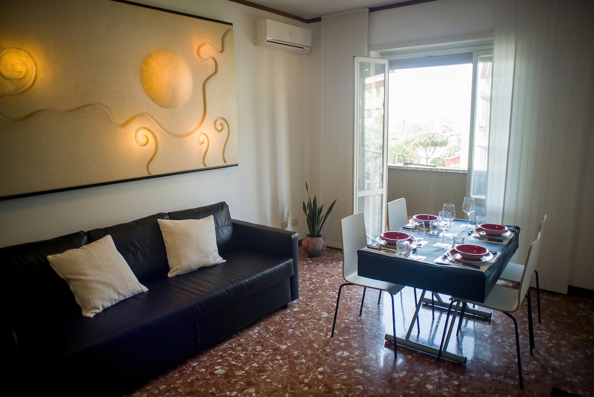 位於羅馬最具特色的地區之一:Garbatella,距地鐵300公尺(距馬西莫競技場2站,距羅馬競技場3站),綠意盎然,讓您體驗真正的羅馬氛圍。公寓非常明亮和寬敞,包括門廊、帶沙發床的客廳、2間明亮的臥室、廚房、1間浴室和2個陽臺(其中一個可欣賞公園和屋頂的美景)。位於剛翻新的建築物的4樓,有電梯。適合情侶、團體和家庭度假或工作。