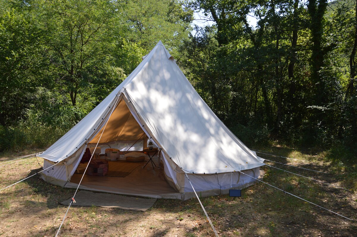 MICA,12 平方公尺的全棉舒適帳篷,步行 5 分鐘即可抵達河邊。一個永恆的地方。 在同一地點的 LA COLLINE VAGABONDE :另有一個帳篷、一個高腳小屋、一個獨立房屋。 帳篷安裝在山坡上,四周是松樹和栗樹。步行 5 分鐘即可抵達美麗的河流。在這裡,我們過著簡單的生活,與大自然和諧相處,我們也喜歡舒適和乾淨。 共用設備齊全的廚房、自來水和熱水 淋浴間和乾式廁所最多可供 2 對夫婦共用。