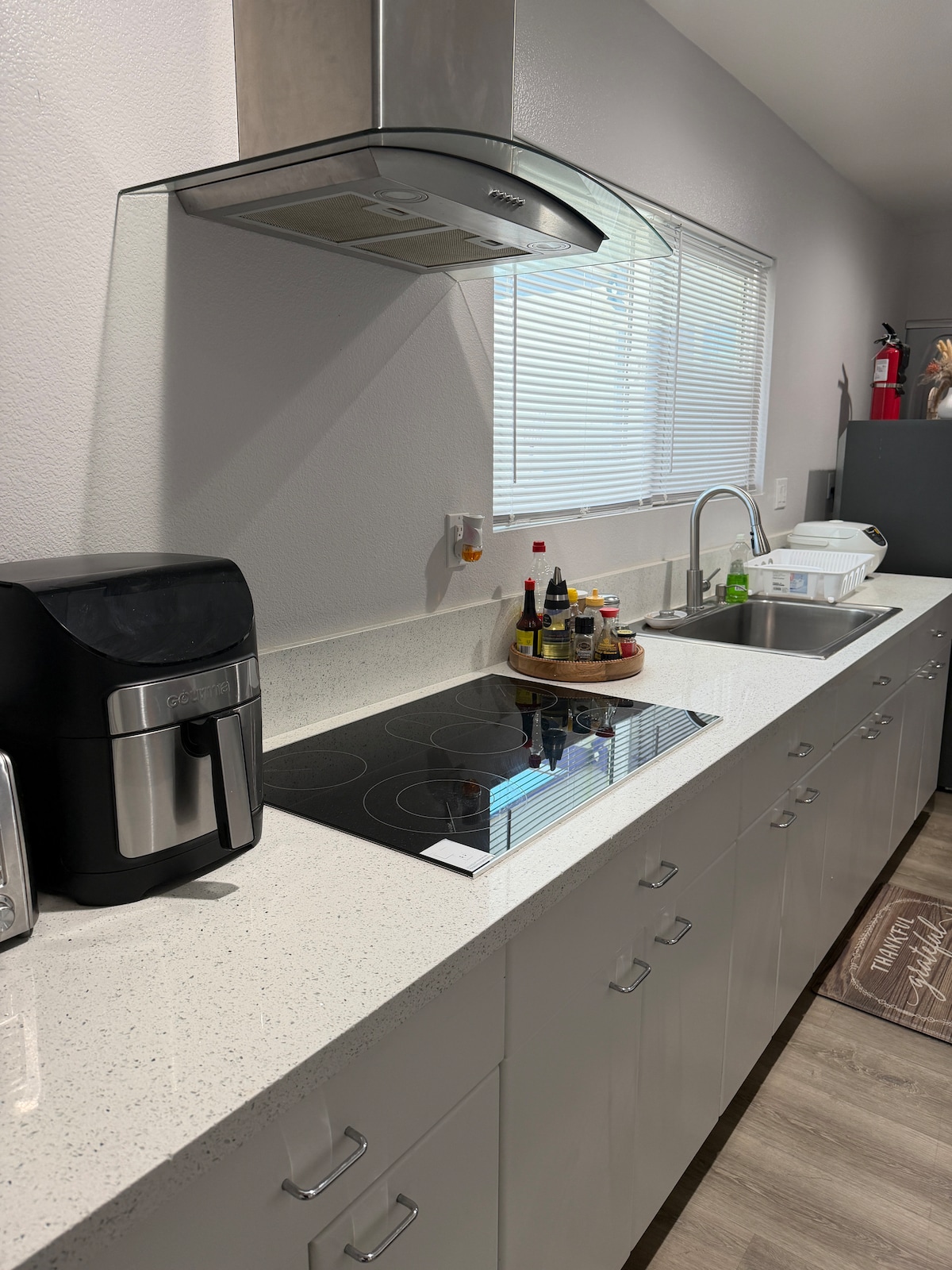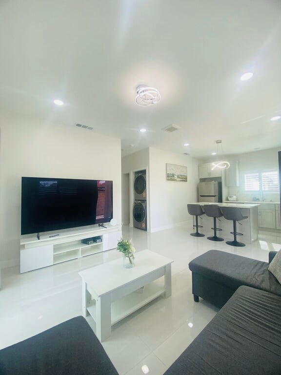 在我們時尚、乾淨、現代化的家具家具中享受放鬆的假期住宿。 這間可愛的小屋包括一個設備齊全的廚房,配有27立方英尺的4門冰箱、全新的前置洗衣機和烘乾機、免費高速WIFI、兩臺55英寸Vizio 4k電視(配備Netflix )、專用工作區域,可滿足您的所有短期和長期需求。