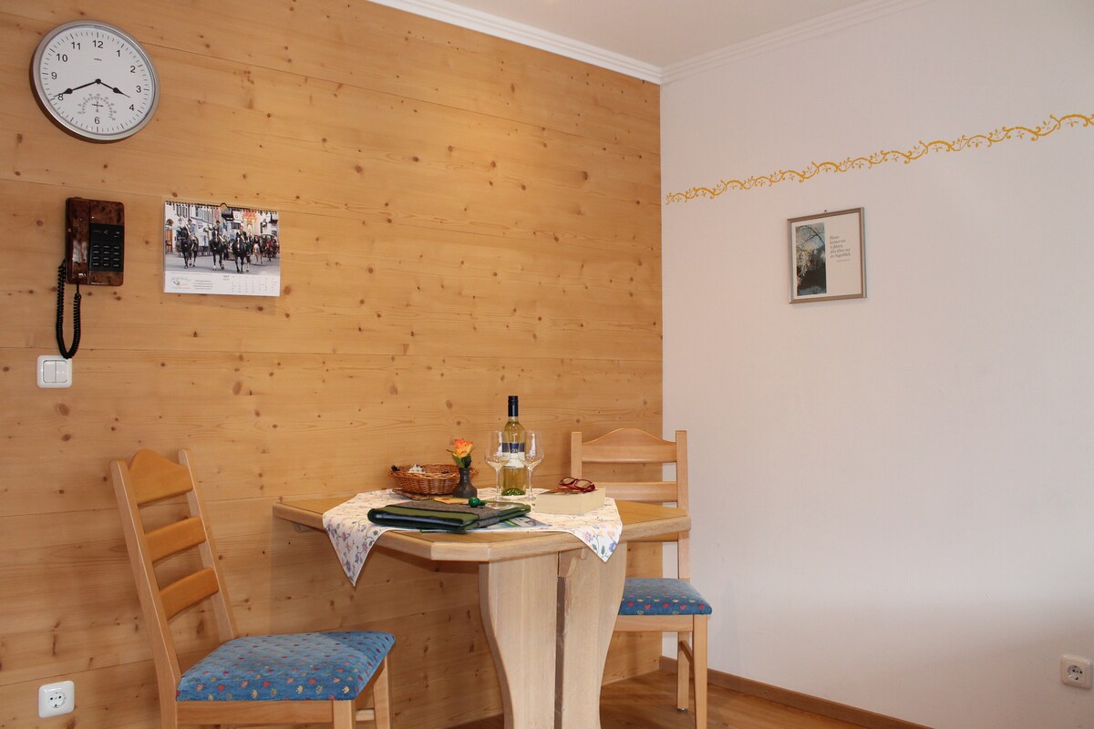 Enjoy the magnificent view of our beautiful Karwendel and Wettersteingebirge of your cozy apartment with 30m ² Living-bedroom with Murphy beds (normal double beds, during the day in the closet, need evening only be expanded) comfortable seating and dining area SAT-TV Stereo system Safe Phone separate kitchen including hob, microwave, fridge with freezer, coffee maker, kettle and compl. Crockery and cutlery Shower / WC hairdryer South terrace or balcony facing south with parasol &garden furniture