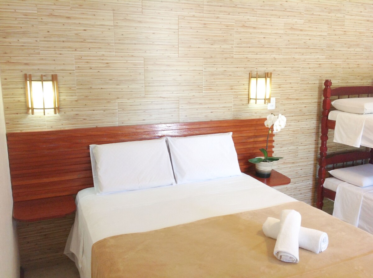 我們的住宿很舒適,配有空調、可收看 Netflix 的智慧電視和超高速 WiFi。 每個小屋都配備了帶高級床墊的床箱和沙發床,以及配備了爐台、冰箱和其他用具的全功能廚房。我們有一個共用燒烤區,配有烤肉串燒架。 我們提供戶外區域,配有泳池、花園和吊床區。 我們提供美味的早餐籃,每天送到您的小屋,價格為每2人80.00雷亞爾。